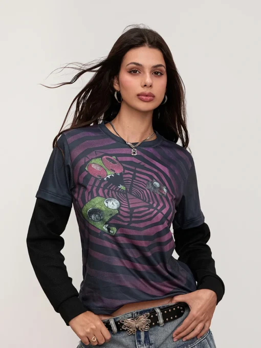 Women Autumn Tops Patchwork Long Sleeve Gothic Graphic Printed T-shirt Casual Shirts Y2K Aesthetic Clotes