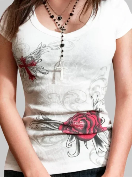 Women T-shirt Rhinestone Flower Print Short Sleeve Round Neck Slim Fit Tee Tops 2024 Summer Gothic Punk Shirts