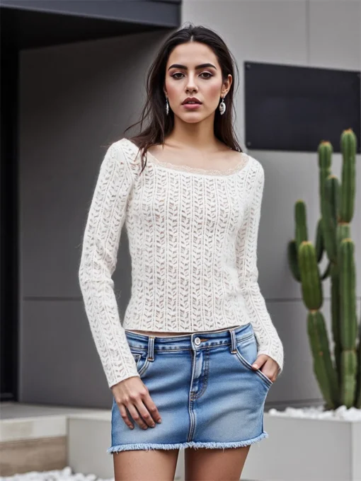 Women’s Fall Lace Trim Tops Leaves Jacquard Long Sleeve Scoop Neck Slim Fit T-Shirts Streetwear