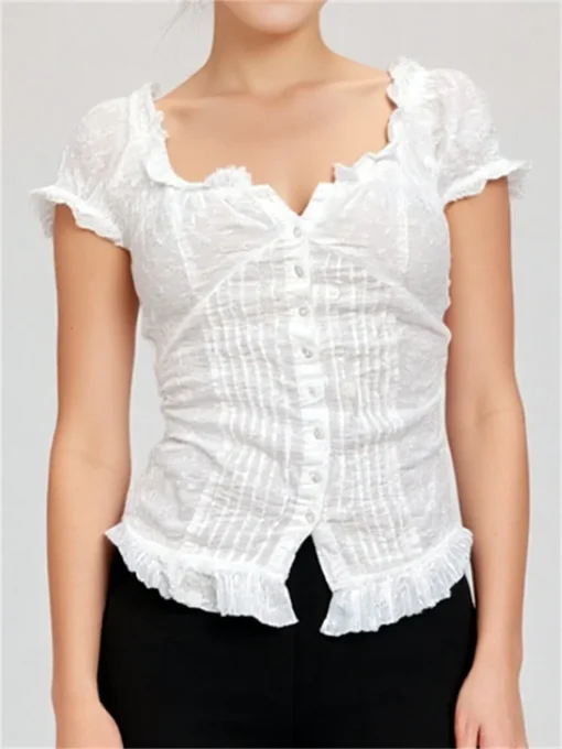 Women Tops Summer Short Sleeve Square Neck Button Down Slim Fit T-shirt Casual Retro Y2K White Shirts