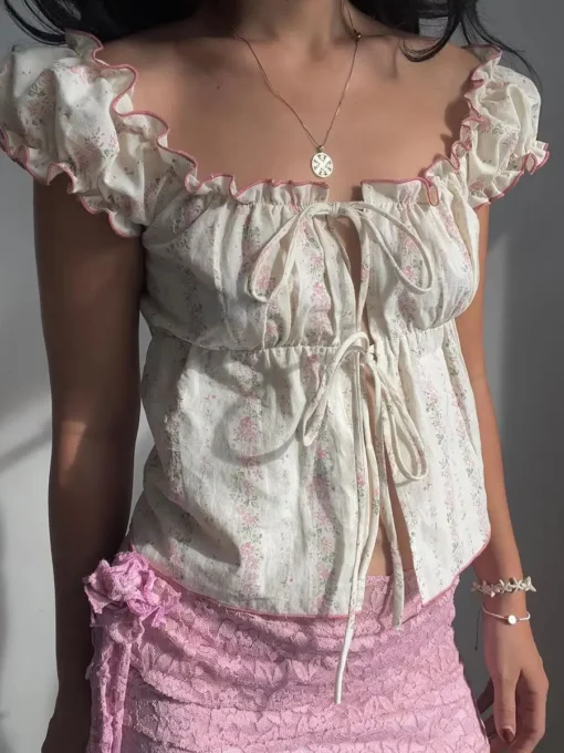 Women’s Floral Print Tops Cap Sleeve Tie-up Front Slim Fit Frill Shirts Summer Cropped Blouses Y2K Clothes