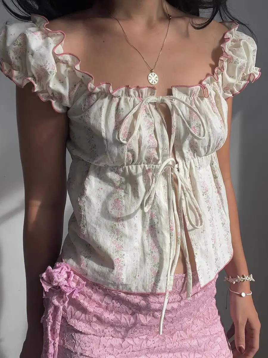 Women’s Floral Print Crop Tops Fashion Cap Sleeve Tie-up Front Slim Fit Frill T-Shirts Summer Blouses