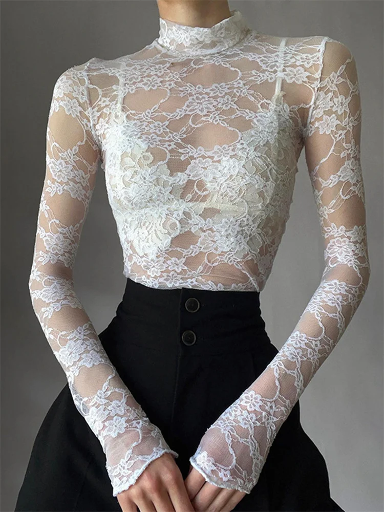 Women’s Lace Floral T-shirt Long Sleeve Mock Neck Lace Slim Tee Tops Summer Sexy Retro See Through Crop Tops