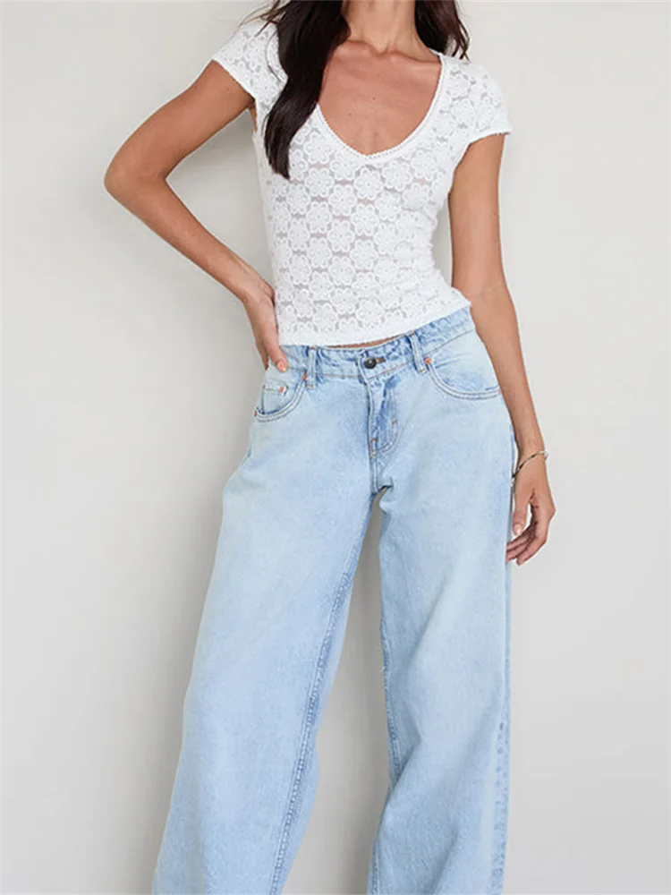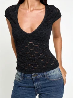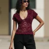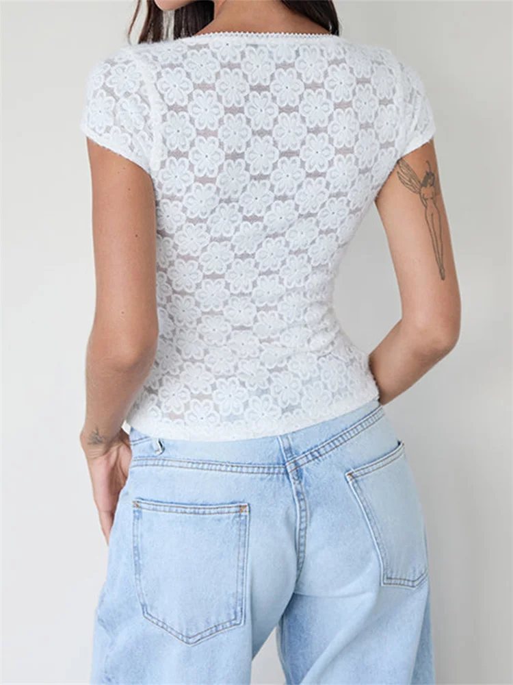 Women’s Summer Lace Floral Tops Short Sleeve V Neck Trendy Slim T-shirt