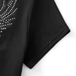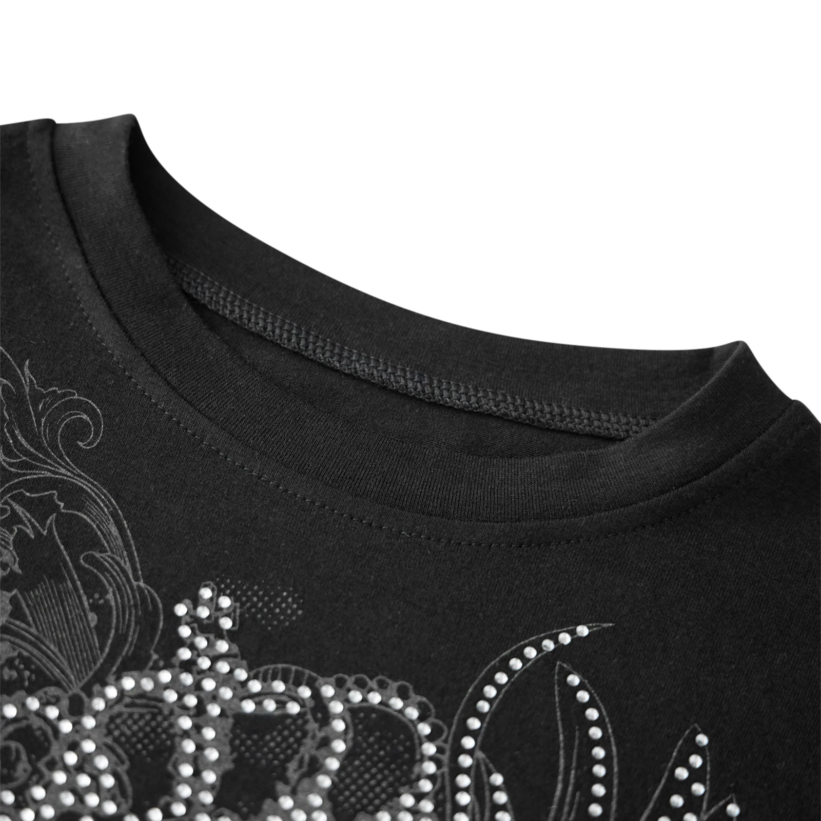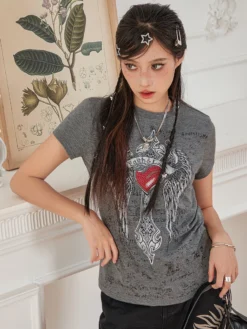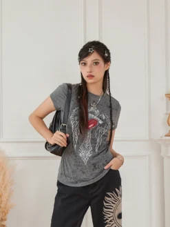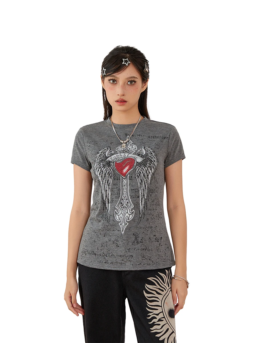 Women´s Slim Gothic Tops Retro Rhinestone Wing Print Cap Sleeve Round-Neck Grunge T-Shirts for Summer Spring