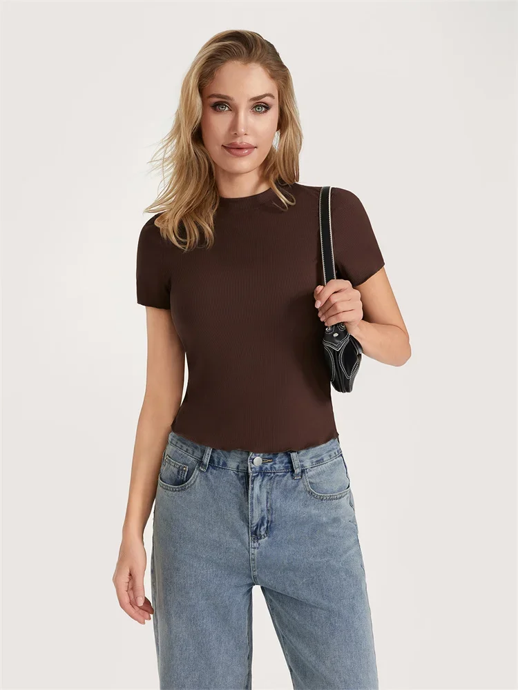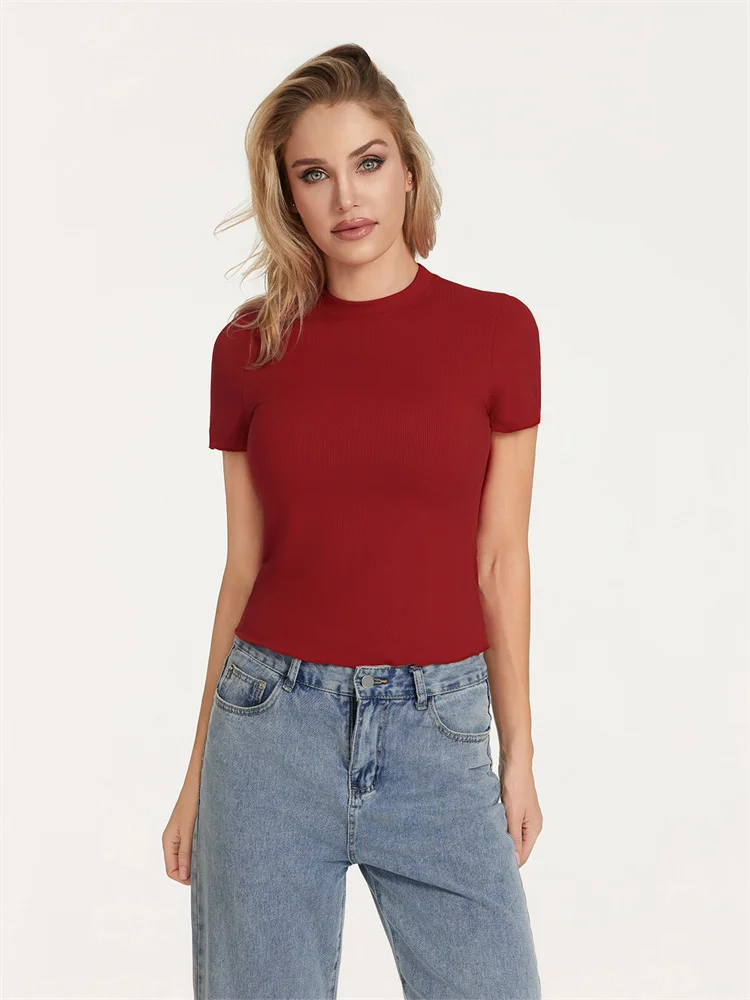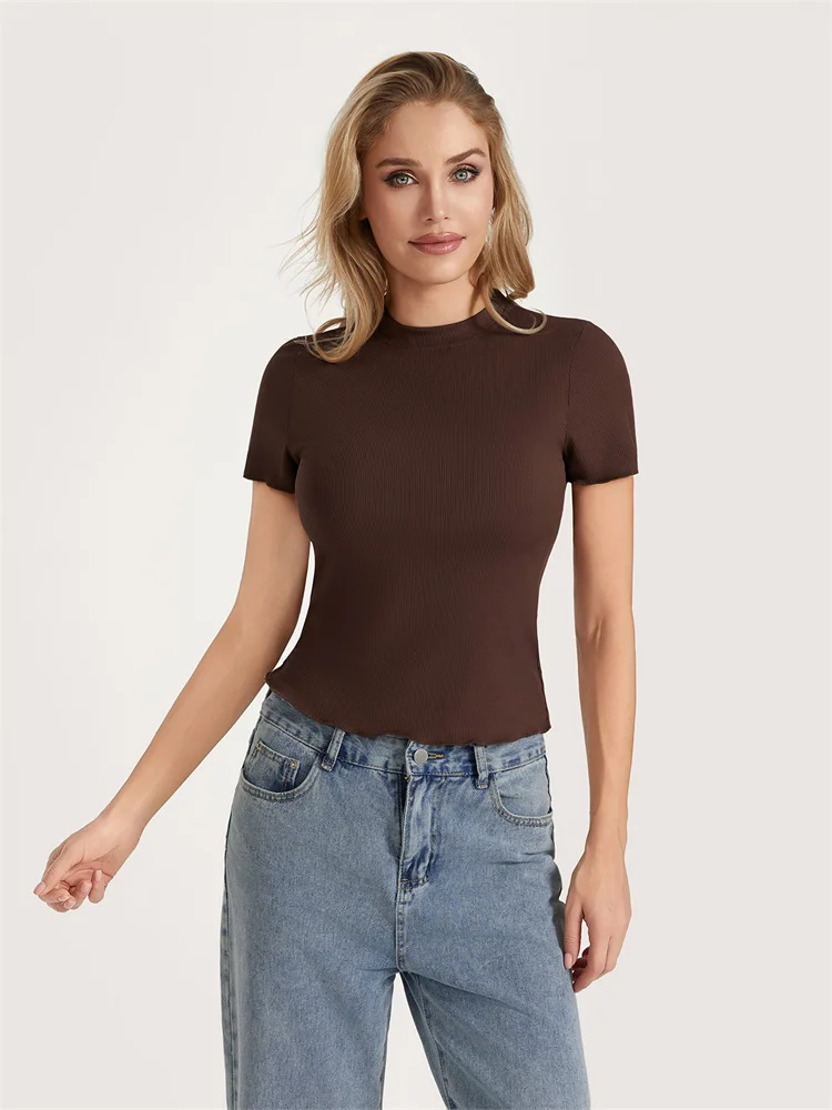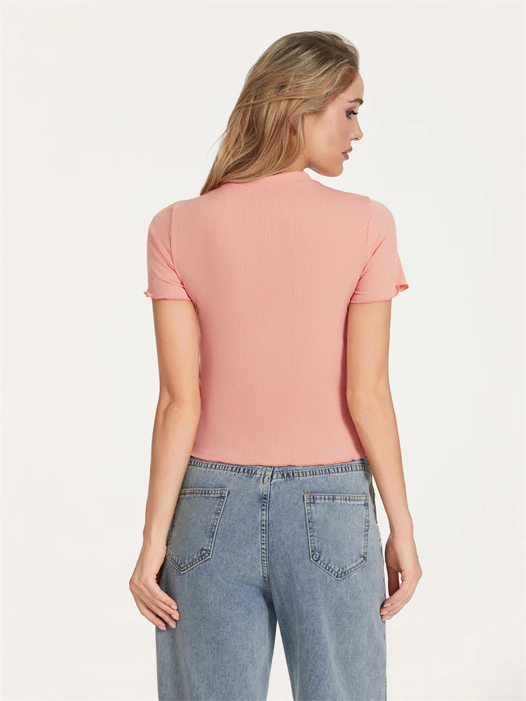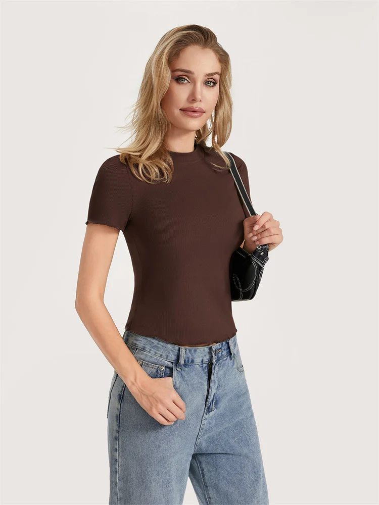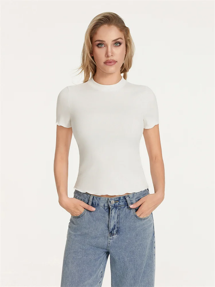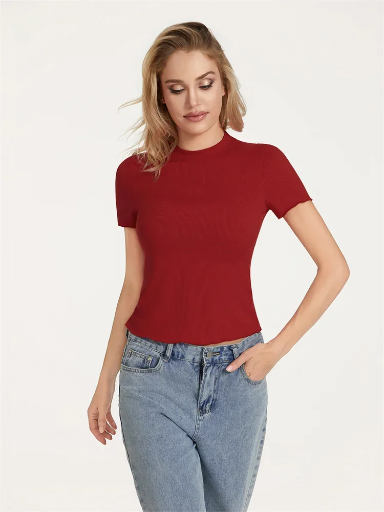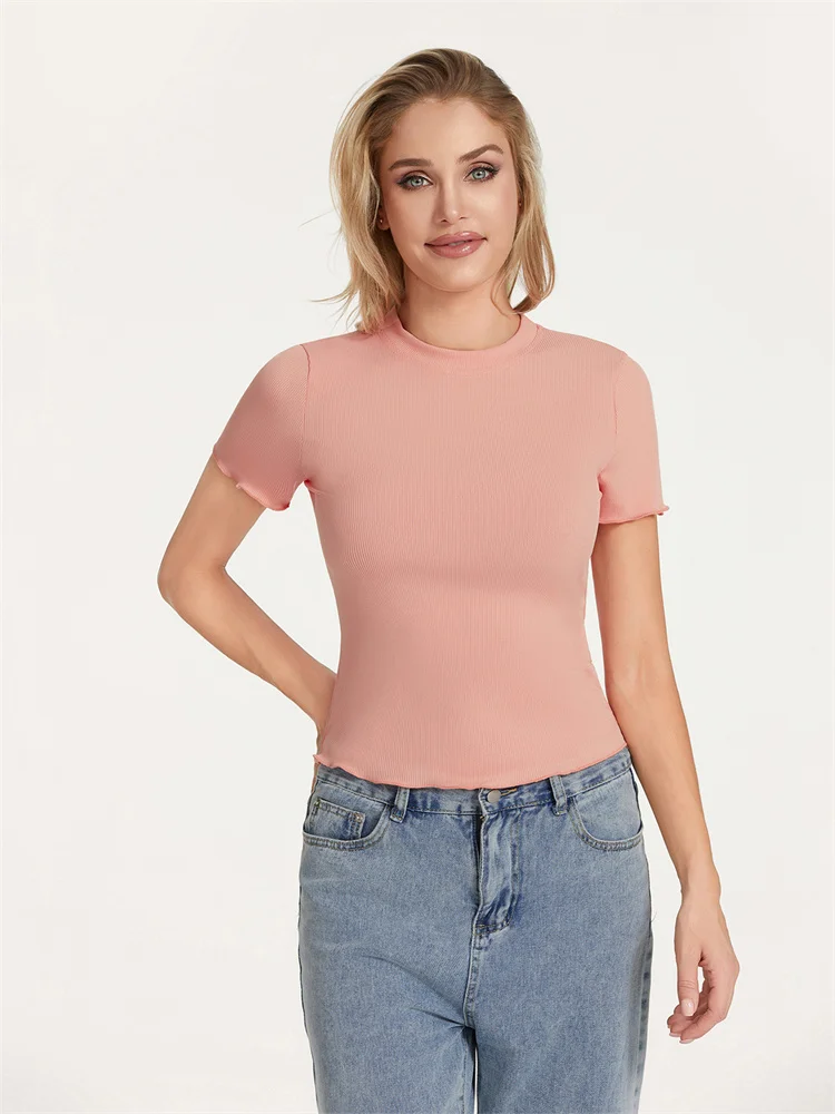 Women’s Summer Solid Color Tops Casual Short Sleeve Crew Neck Lettuce Trim T-Shirts Streetwear